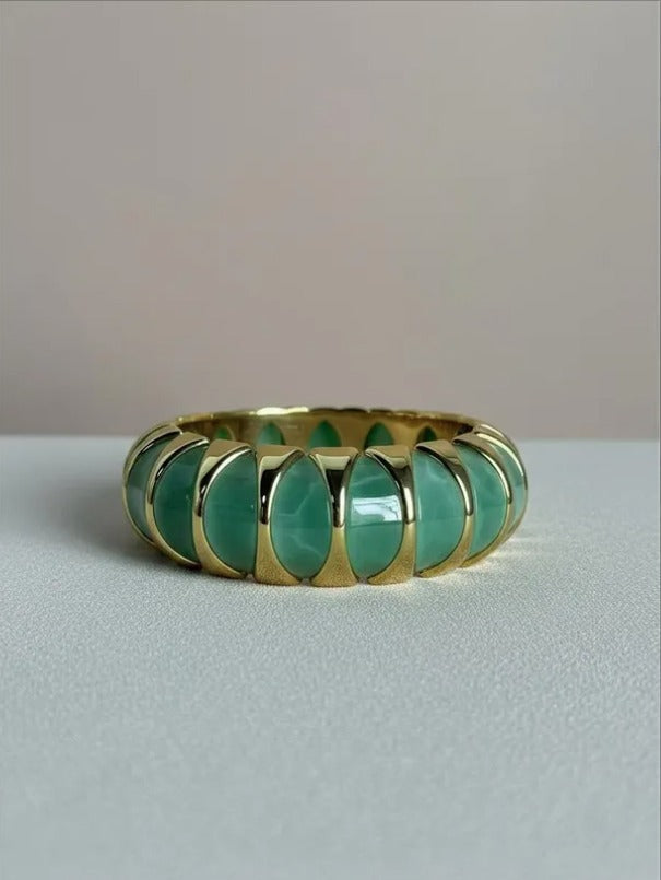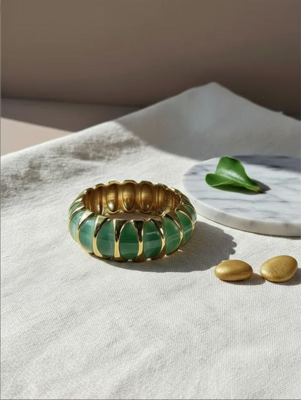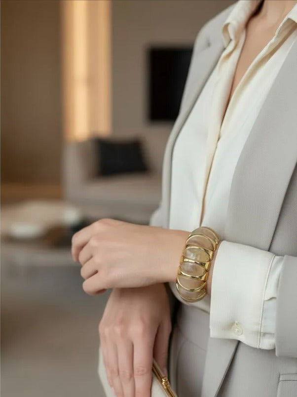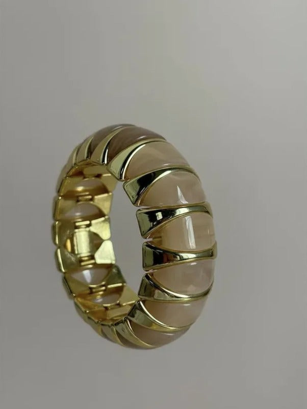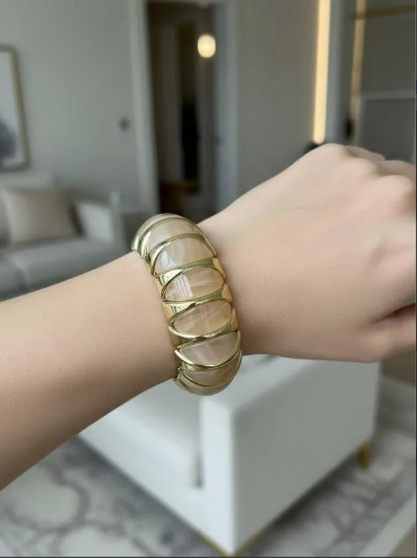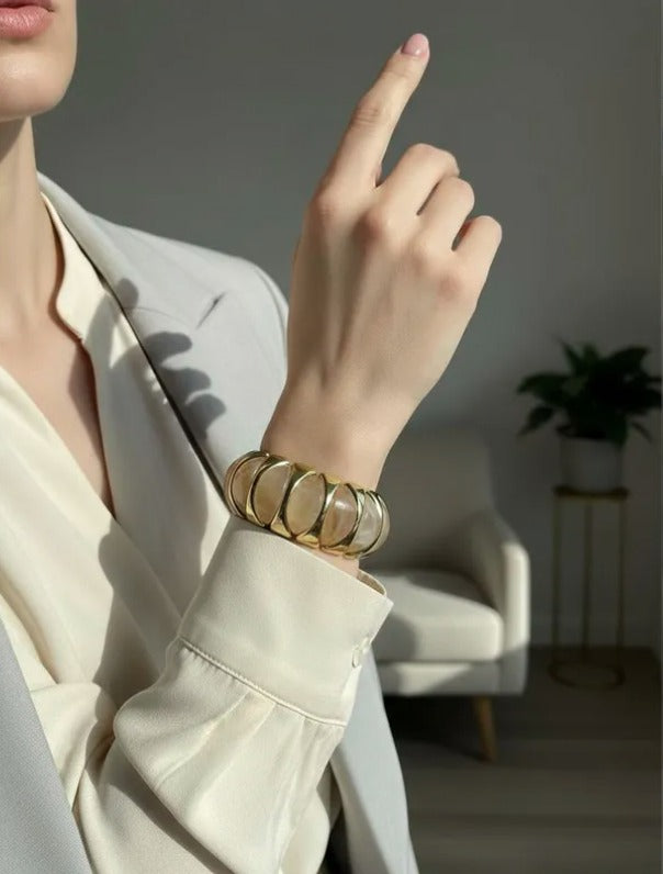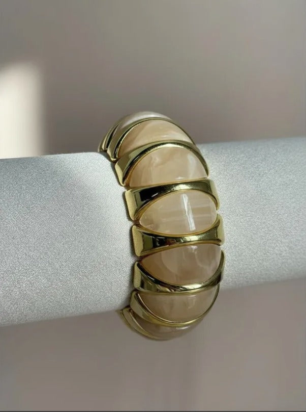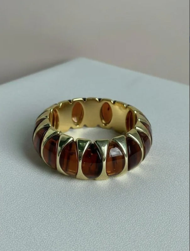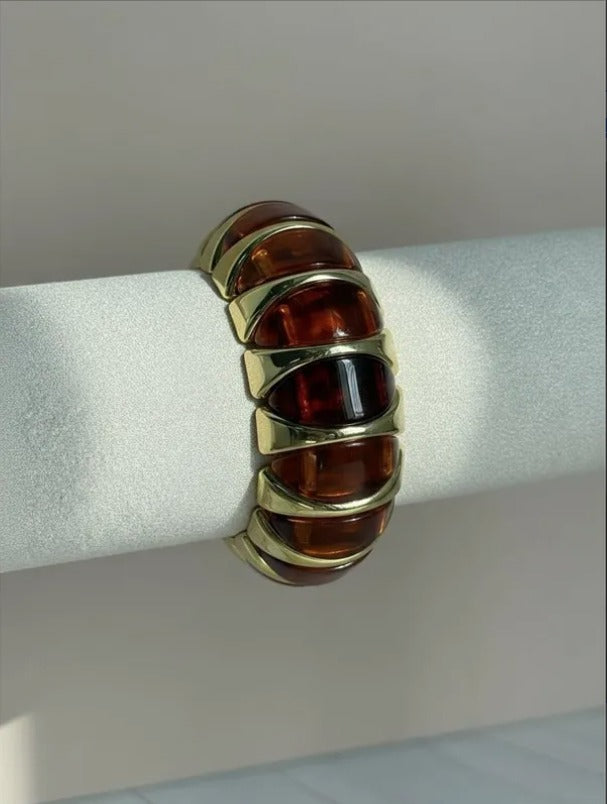El brazalete Aura presenta un diseño elástico en acrílico tipo carey enriquecido con delicados acentos dorados que reflejan sofisticación.