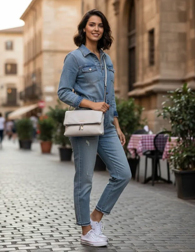 Su diseño compacto de 26 cm de alto, 16 cm de largo y 7 cm de ancho cuenta con una asa larga tipo crossbody que facilita su uso diario.