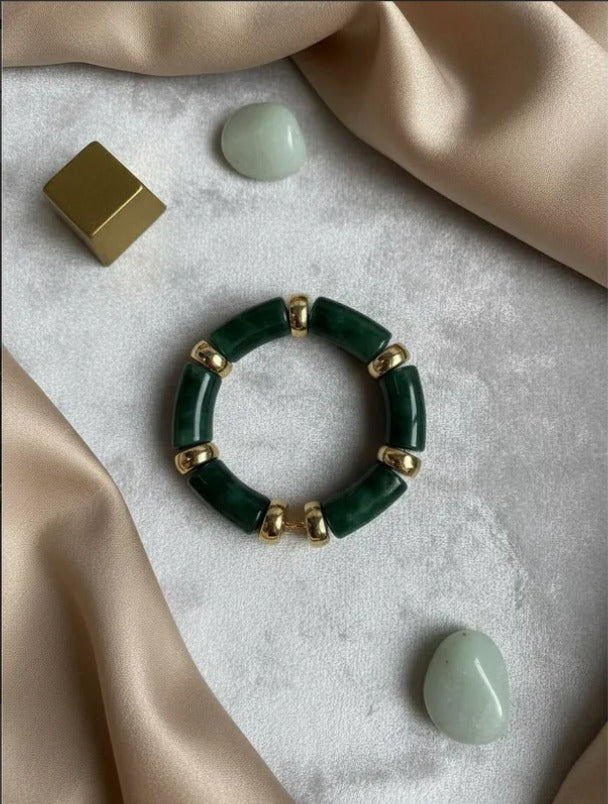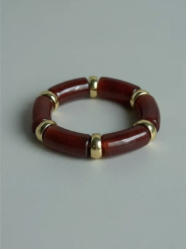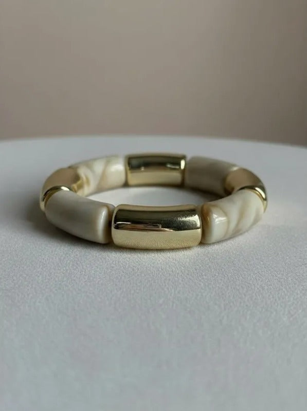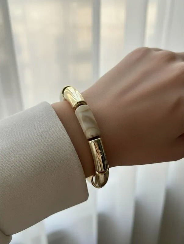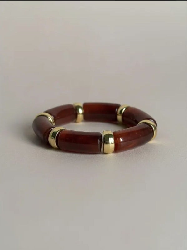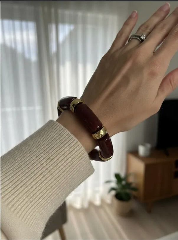 Este brazalete Luna, elaborado en acrílico tipo carey con detalles dorados, combina elegancia y versatilidad.