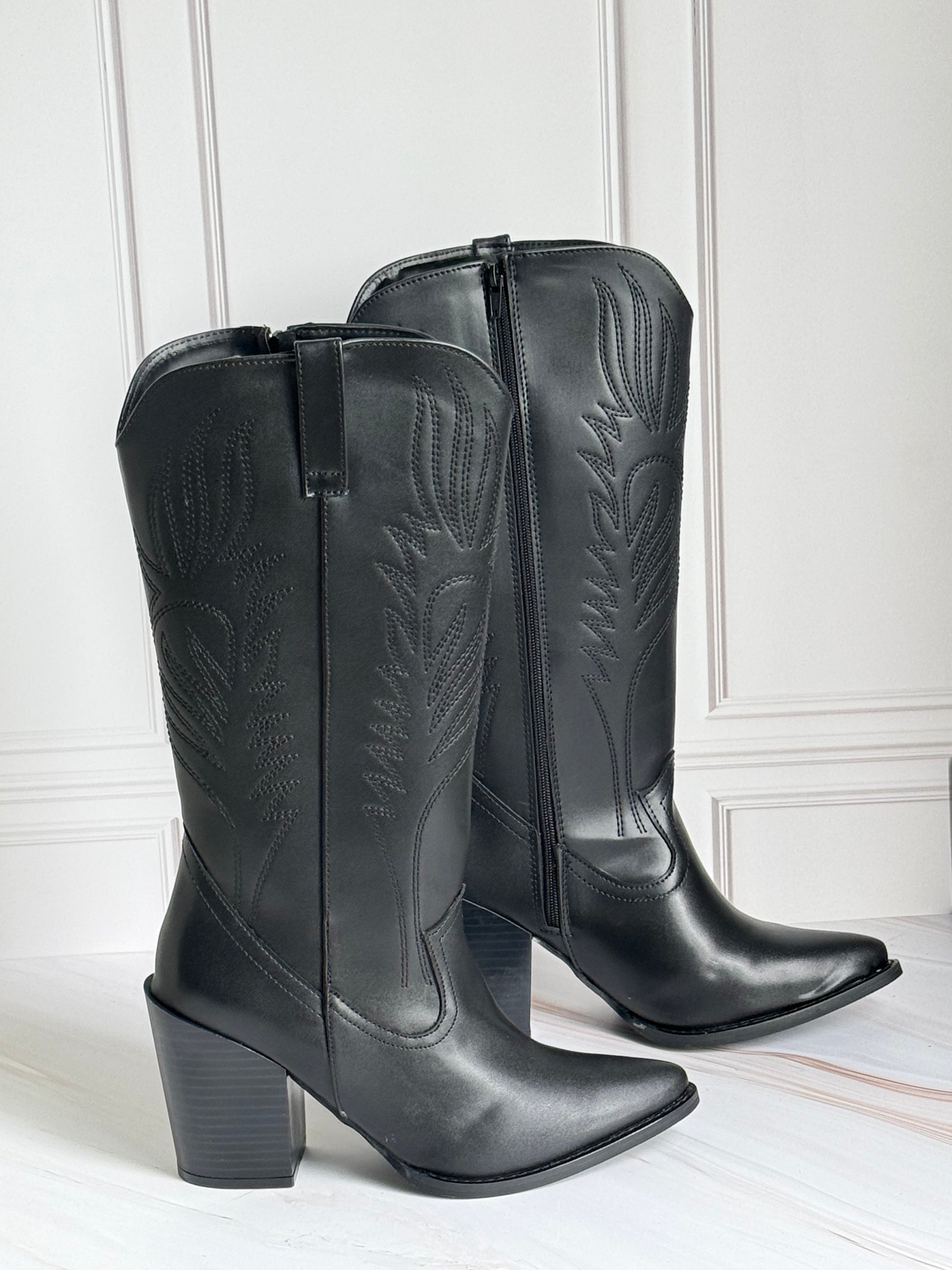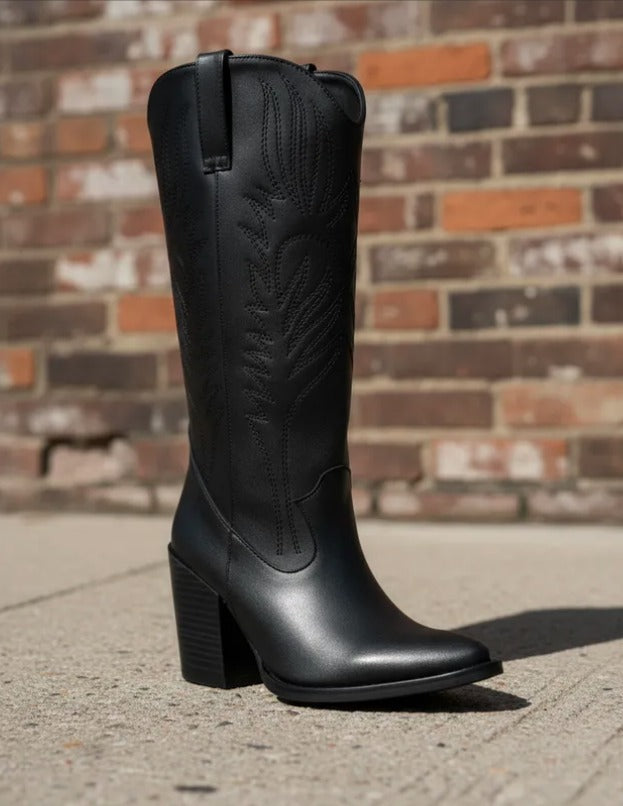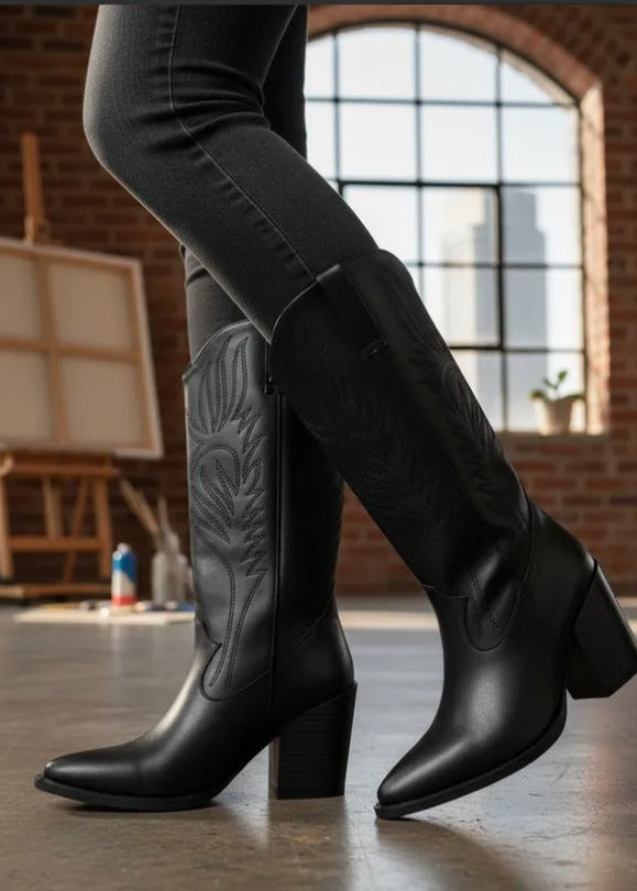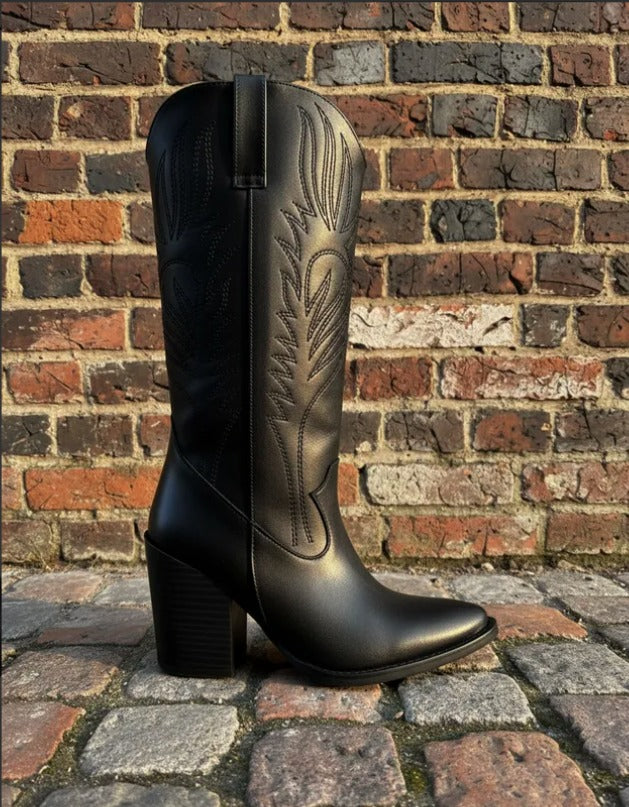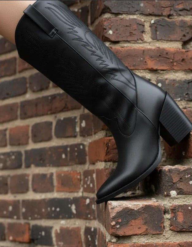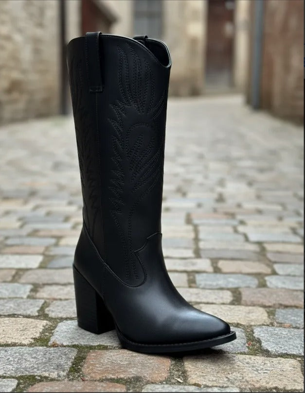 Descubre la bota Clay, una pieza semi larga estilo vaquero que combina elegancia y comodidad. Elaborada en piel sintética con delicados bordados y acabados brocholeados, aporta un toque único a tu look.