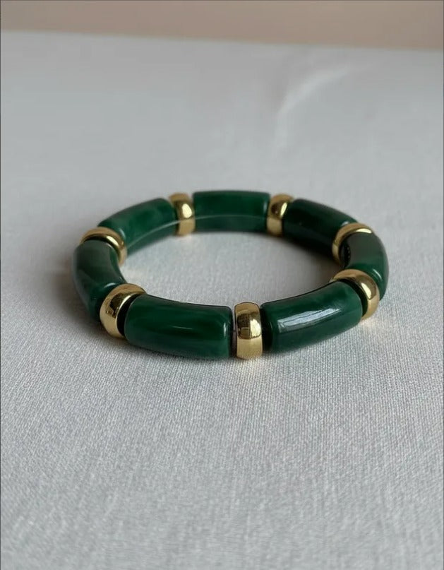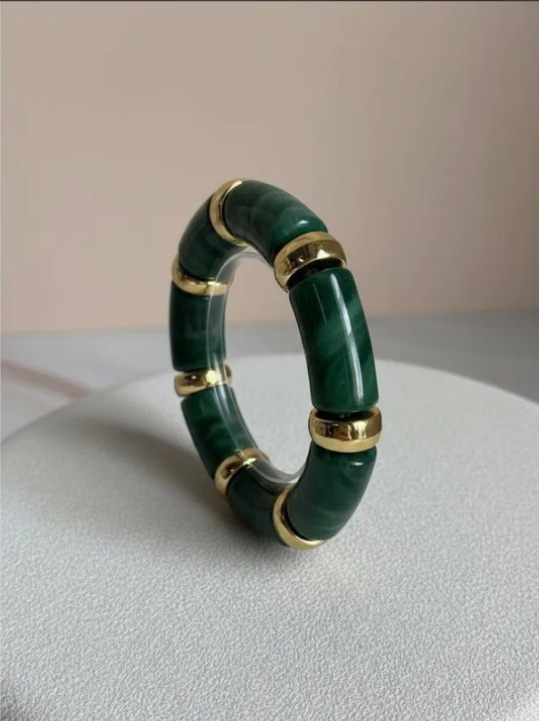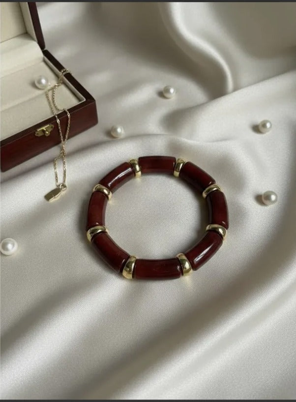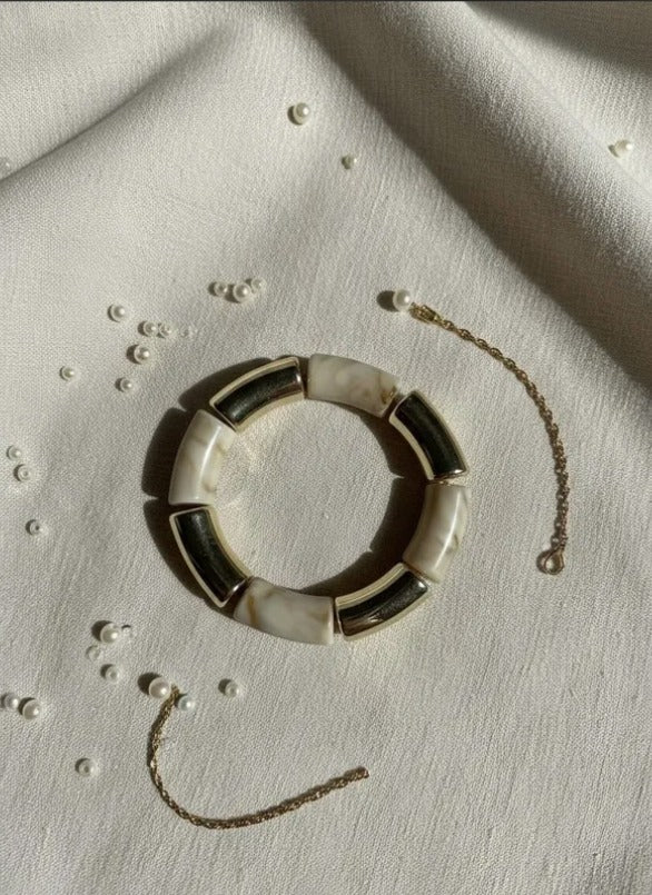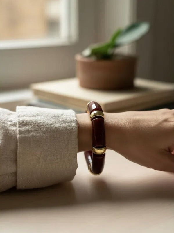 Este brazalete Luna, elaborado en acrílico tipo carey con detalles dorados, combina elegancia y versatilidad.
