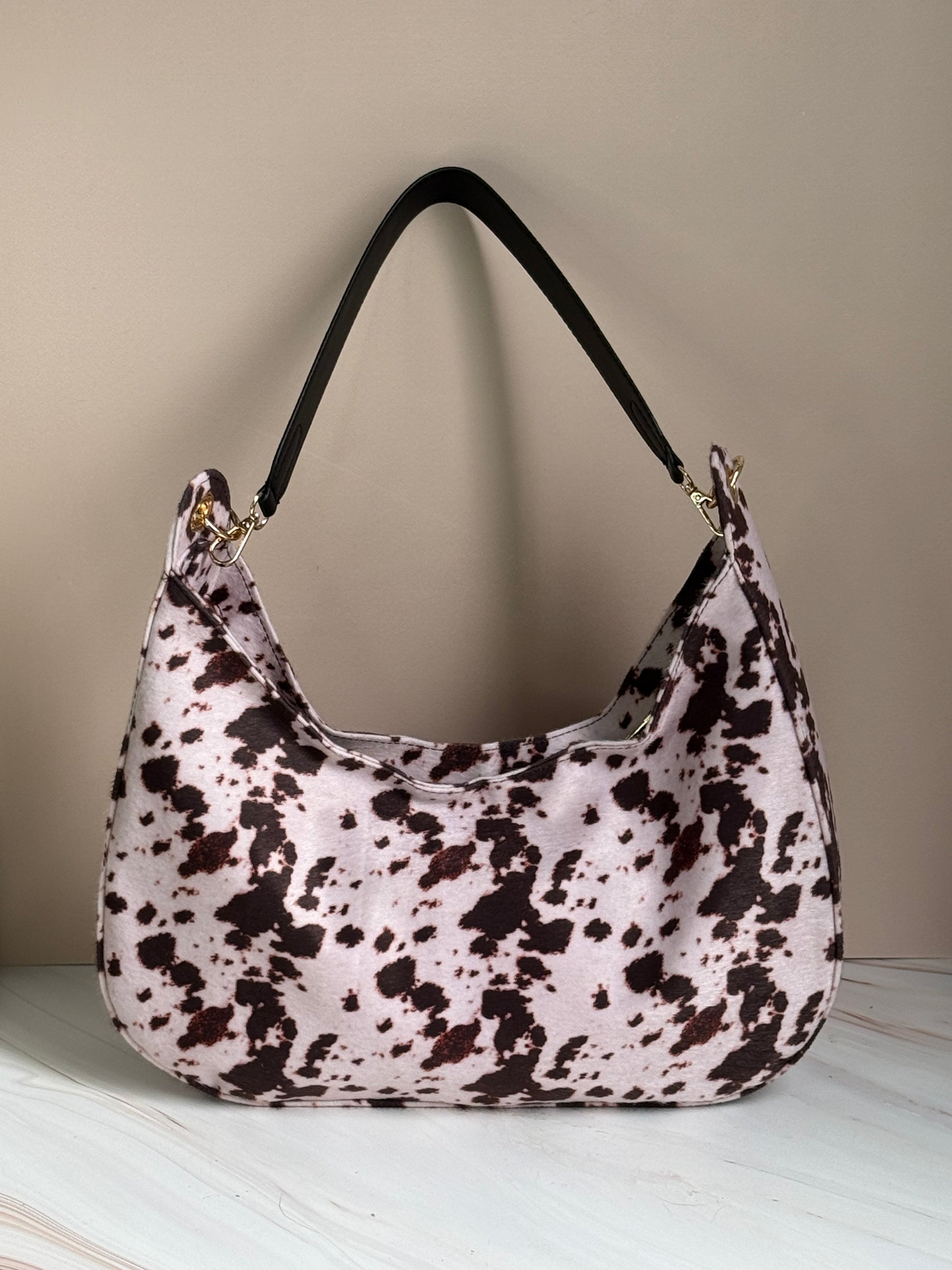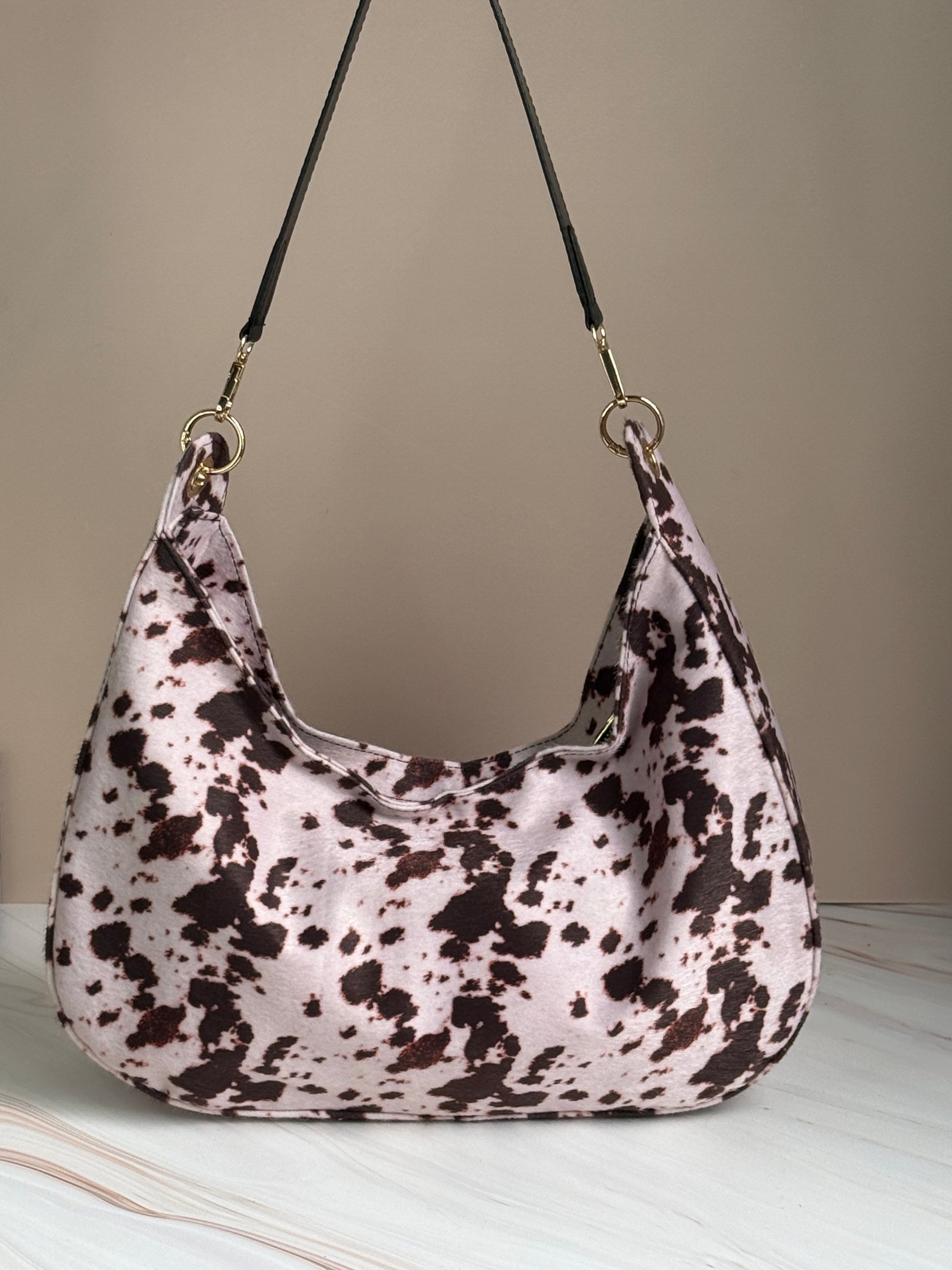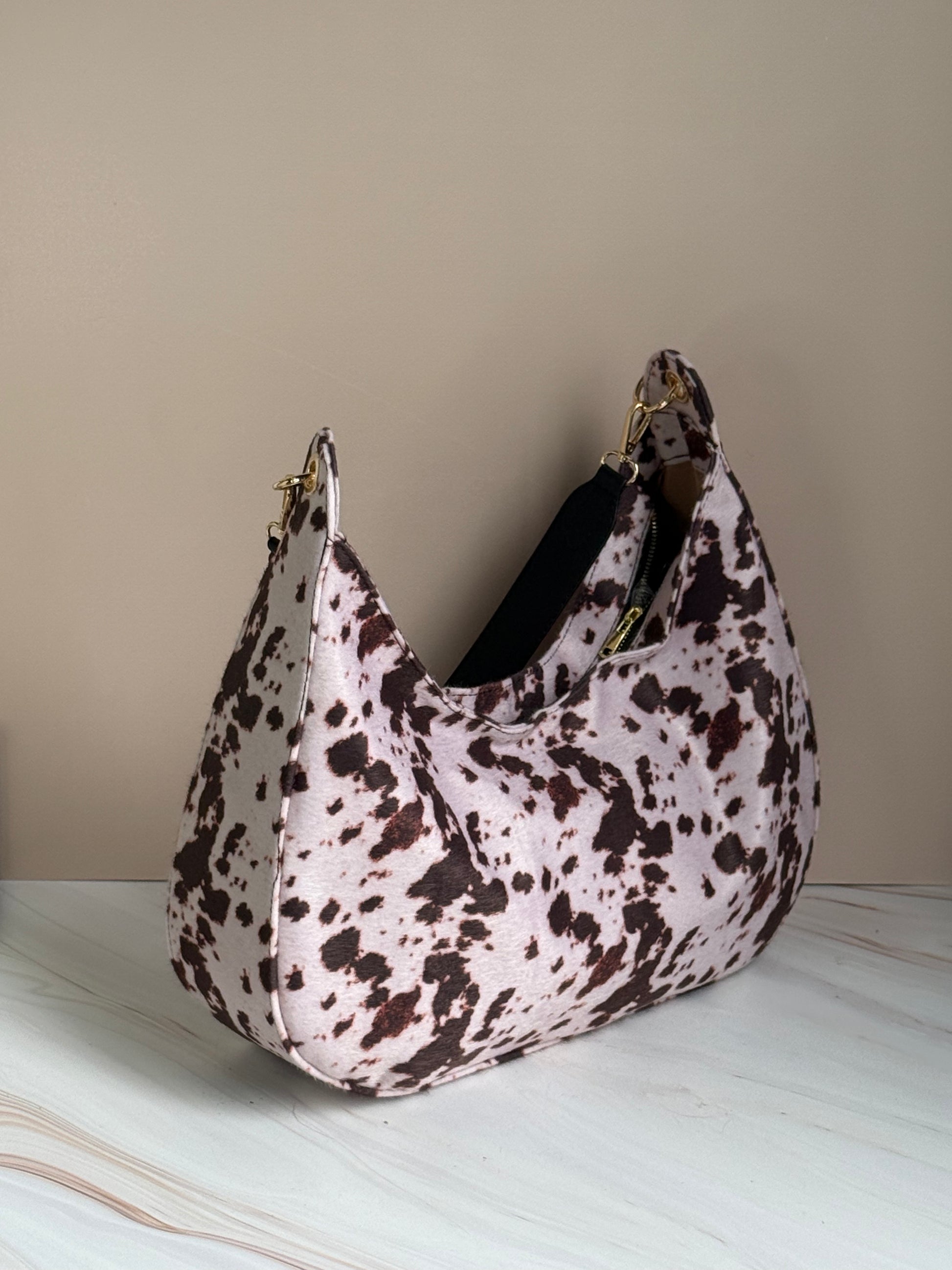 La bolsa Sophie combina estilo y funcionalidad con su icónico print de vaca, la tendencia de la temporada.